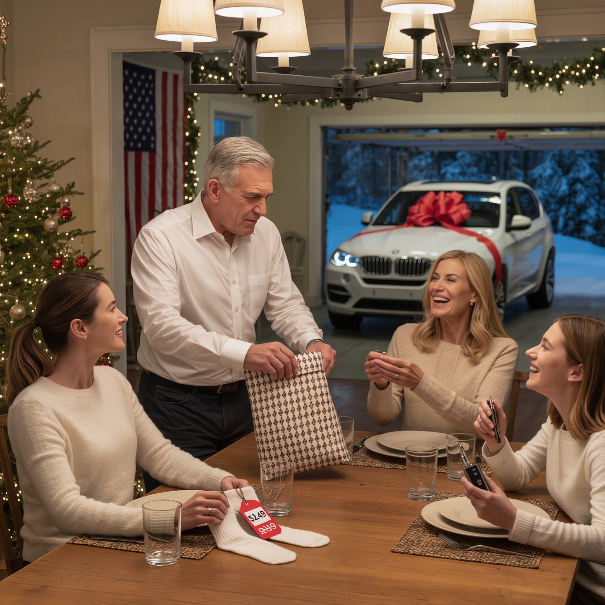 I stało się. BMW X5, rok 2026, biały lakier tak błyszczący, że odbijał się w nim jak gwiazdy, niczym w sznurach lampek garażowych. Na masce wisiała ogromna czerwona kokarda, jaskrawa jak znak stopu, a wstążka rozciągnęła się na przedniej szybie niczym wstążka na pudełku prezentowym.