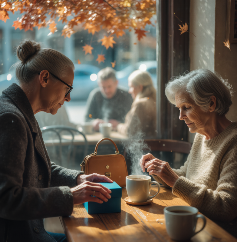 Z rozmysłem i ostrożnością położyła niebieskie pudełko na stole między nami. Jej palce drżały – tylko lekko.