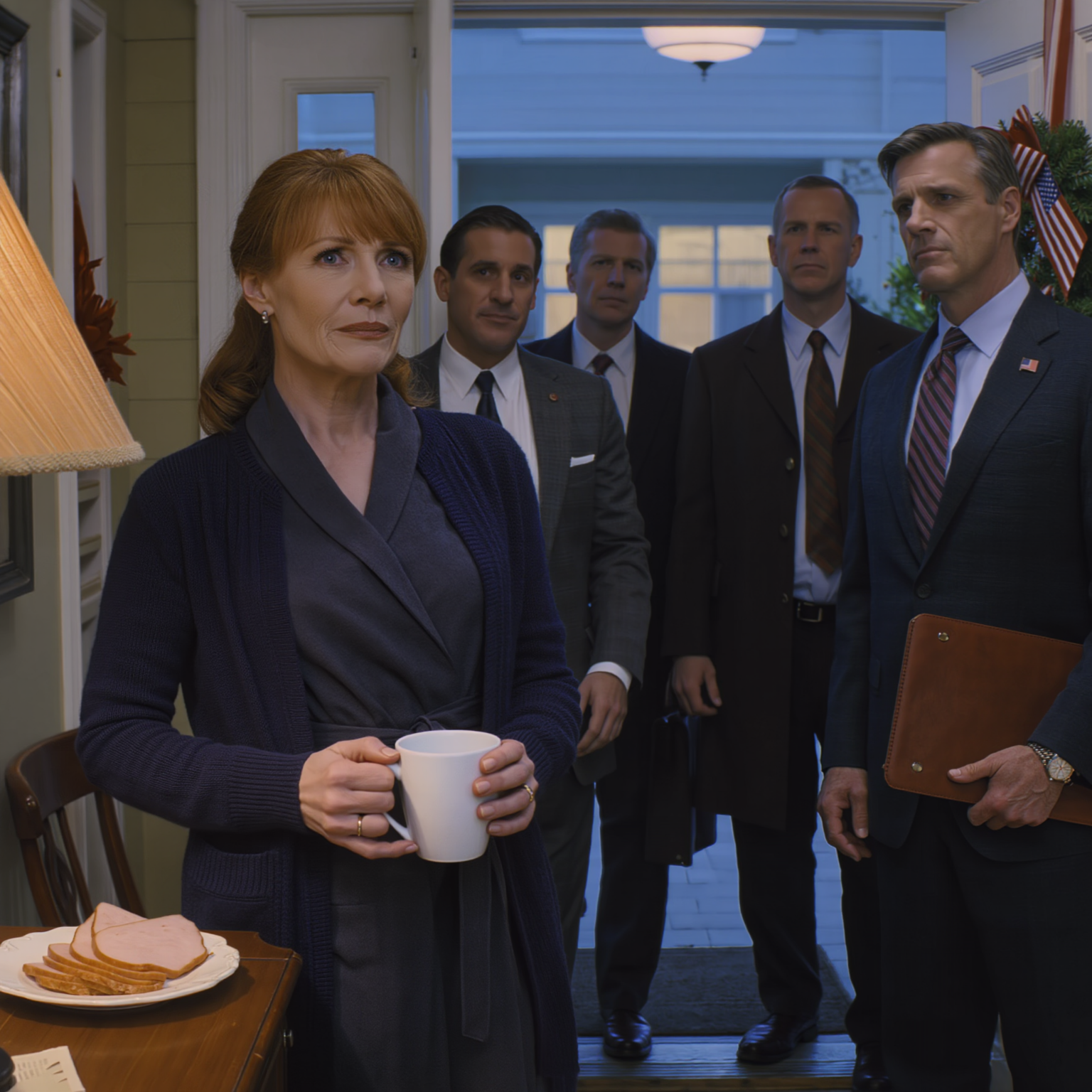 Ponownie spojrzałem na zegarek – 11:02 – i podszedłem do wejścia z ostrożnym przerażeniem, które zawsze ogarnia mnie, gdy w domu panuje cisza od dłuższego czasu. Przez wizjer zobaczyłem trzech mężczyzn w ciemnych garniturach stojących na ganku w ciepłym, żółtym blasku lampy.