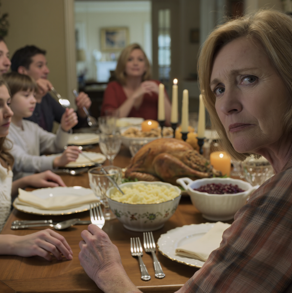 Usłyszałem, jak moja siostrzenica gwałtownie wciąga powietrze obok mnie. Jedno z dzieci upuściło widelec. Głośno uderzył o talerz w ciszy. Eric zamarł w połowie porcji, z nożem wciąż wbitym w pierś z indyka, a jego twarz pobladła niczym obrus.