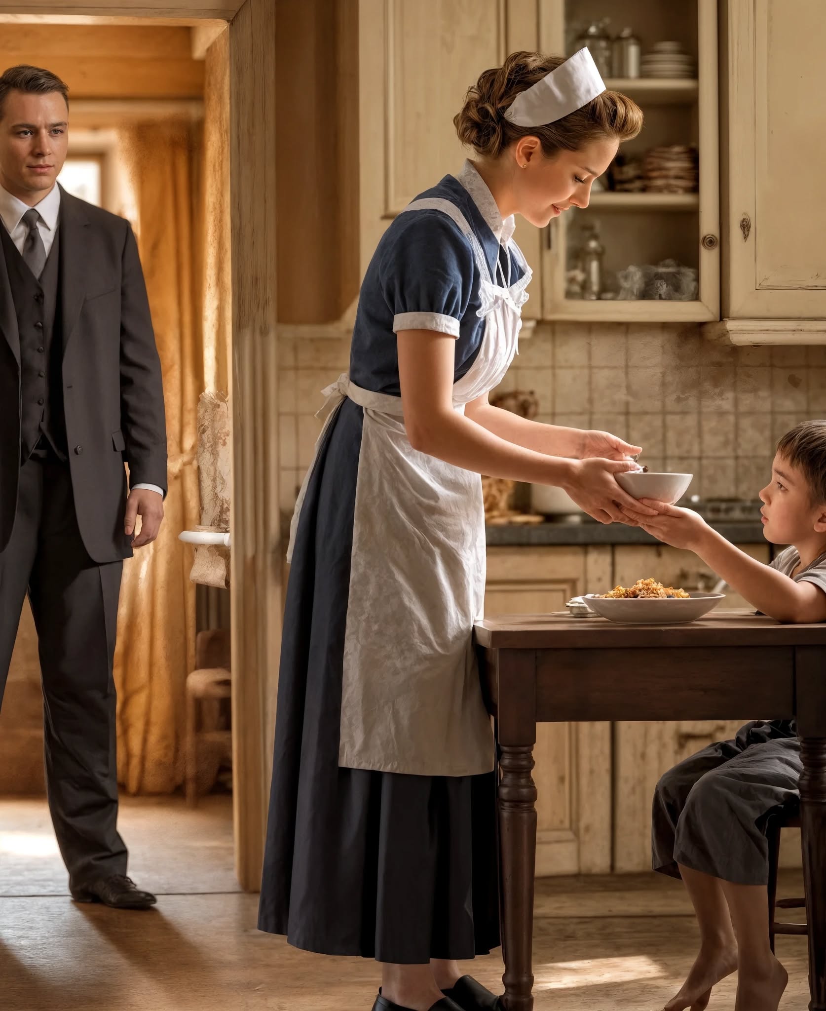 Maria nie wiedziała, że James Lancaster, właściciel domu, wrócił do domu wcześniej niż się spodziewał. Jego podróż została przerwana przez pozornie niekończące się spotkanie biznesowe. Dojeżdżając do podjazdu, zauważył uchyloną bramę i zmarszczył brwi. Wszedł do środka na palcach, spodziewając się zwykłej ciszy pustego domu. Nagle usłyszał brzęk metalu, cichy dźwięk łyżki uderzającej o porcelanę. Zaintrygowany, poszedł za tym dźwiękiem do kuchni – i zobaczył służącą, zgarbioną w kącie, obserwującą małe, nieszczęśliwe dziecko pożerające posiłek z delikatnego talerzyka. Widok był tak uderzający, że o mało nie upuścił serwetki.